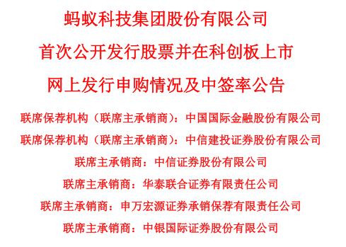 蚂蚁集团A股中签 率出炉。