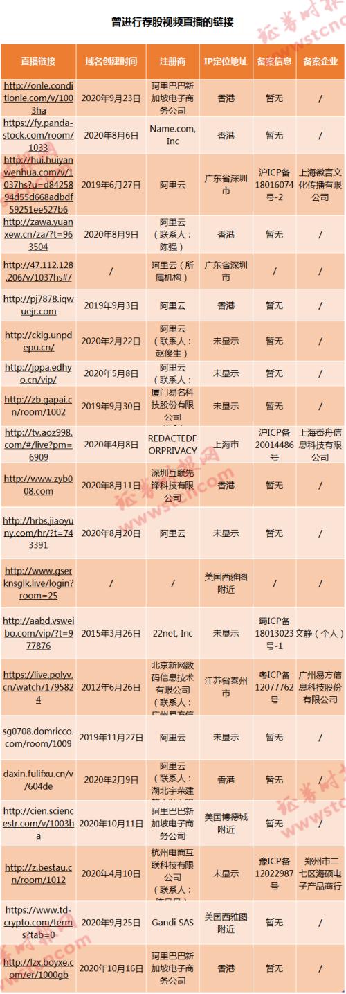 证券时报记者对曾进行过直播荐股的20余个链接进行分析,发现这些链接均为近期注册域名,服务器多设置在境外,其中小部分进行了ICP备案,但是在该等域名服务商名下,实际使用者难以查证。证券时报记者进一步了解到,一个简单的域名注册首年费用不超过30元,做一场时长60分钟、千人观看规模的视频直播仅需1200元左右,与收益相比,成本可谓极低。