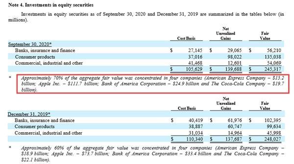 截至2020年9月30日,伯克希尔·哈撒韦大约70%股票持仓集中在四只股票:美国运通(持股152亿美元)、苹果(1117亿美元)、美国银行(249亿美元)、可口可乐(197亿美元)。对比去年年底前四大重仓股没有发生变化,但持股集中度明显提高。当时伯克希尔·哈撒韦大约60%的股票持仓集中在四只股票:美国运通(持股189亿美元)、苹果(937亿美元)、美国银行(334亿美元)、可口可乐(221亿美元)。