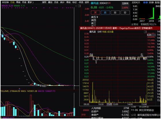 行情数据显示,暴风集团(注:目前简称暴风退在A股市场的最后一个交易日股价波动较大,盘中一度低见0.27元,临近收盘却出现一波拉升,但尾盘再度下行。