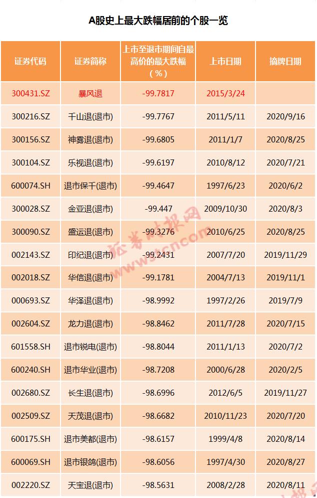值得注意的是,暴风集团从上市到退市期间,自历史高位的最大跌幅高达99.7817%,创下A股历史上个股最大跌幅纪录。